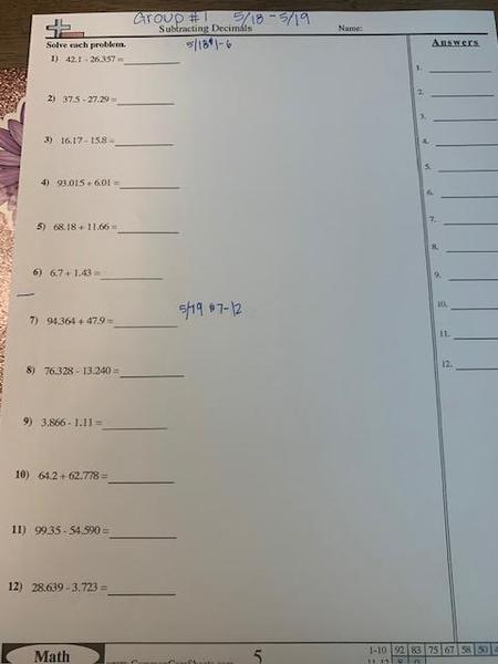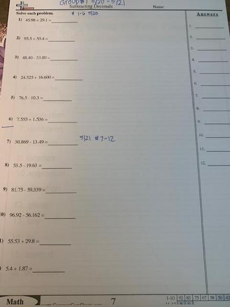 Worksheet on Adding/Subtracting Decimals #5-8