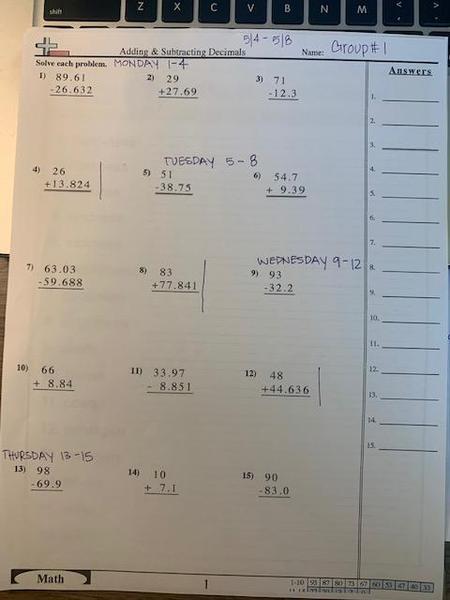 Worksheet on Adding/Subtracting Decimals #1-4
